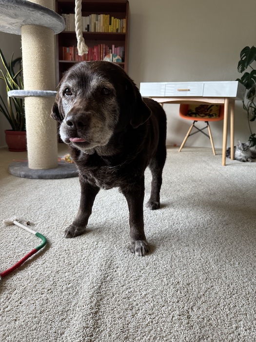 In fact, her slow pace has been kind of a delight, because as we mosey along with her whuffling up the smells of the world I can more nosily peer at my neighbors’ front yards and stoops. One time I met up with my neighbor pal and her Lab and that was extra nice. I used to be anxious with Ruby on walks because she had some leash aggression, not sure that’s the right term for it but she could be kind of rude and barky at other dogs if approached when on leash. This does not seem to be any kind of issue now, perhaps like many of us in older age her once-lush field of fucks has reduced in size and focus over the years. Also she’s mostly deaf, has the aforementioned mobility issues, and while relentlessly sweet may be a little on the senile side now.