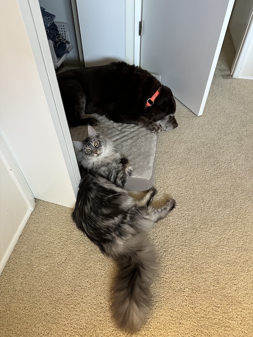 In the house, when they’re not trailing me around, Ruby mostly rests and Billy works up various approaches to try and scare her/entice her to play. If I’m nearby he gets especially bold, and comes in to lightly swat her tail then go shooting off at top speed. Or he’ll do this absolutely hilarious routine of morphing into the classic Halloween cat position — back arched, fur on end, ears in airplane mode — then somehow without adjusting anything he comes flying in with a Tokyo drift type maneuver before skittering away like a crab.