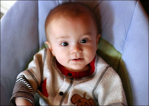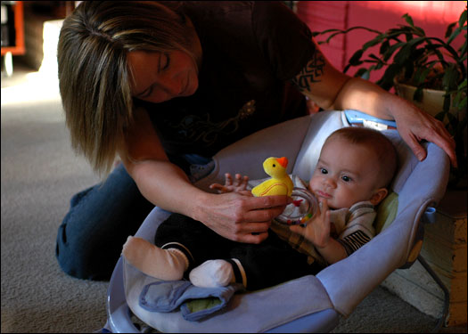 | Tuesday, March 14, 2006 Thank you to those who left helpful comments on the last entry! I love that somebody always has experience in whatever I'm interested in. If I wrote that I was going to start breeding fainting goats, I bet at least one of you could give me some solid tips on the subject. (Oh please someone prove me right, that would be so freaking cool.) I asked about Riley's pre-sleep habits because it's definitely been on my mind lately. He almost never just falls asleep on his own anymore, unless he's being pushed in the stroller or riding in the carseat. When he gets tired, he gets fussy - a progressively obnoxious downward slope from "whiny" to "filled with a white-rage capable of melting nearby plastic objects". Every day before he takes a nap or goes to sleep for the night we have to spend a varying amount of time dealing with the fussiness and trying to get him to I used to rock Riley to sleep, which I enjoyed. It was nice to have that quiet time together, and there's something magically delicious about holding a baby who's warm and comfortable and drowsy, listening to the sound of their breathing become slow and steady and feeling their body relax into yours. Now, however, he is not happy with being rocked. At all. Rocking him will still eventually put him to sleep, but you have to be willing to endure twenty-plus minutes of high volume screaming and arched-back fishflopping until he finally passes out from sheer exhaustion. So I typically push him around the living room in his stroller. Some nights JB does the rocking chair thing, and emerges pale and twitchy and covered in snot and drool, and some nights I wear a path in the carpet and push Riley back and forth, back and forth, back and forth, until I feel like a deranged zoo tiger. It's like he just fights off sleep with everything he has, until something - some combination of movement or noise or mystical alignment of the planets - helps him give in. This doesn't seem ideal, and not only because it drains us of our will to live on a daily basis. Shouldn't he be able to sleep without getting so traumatized beforehand? And what if we're traveling somewhere without a stroller? MY GOD, WHAT IF I'M TRAPPED ON A PLANE WITH A TIRED BABY? (Seriously, taking Riley on a long flight? I would rather eat a handful of fire ants. Licorice-flavored fire ants.) You know, it seems like caring for a baby would be a series of no-brainer moves: feed them, don't allow them to become coated with filth, keep the wild dingos from devouring their tasty flesh. It seems like the murky parenting issues - how to discourage your teenager from spending their spare time carving up 2-liters of 7-Up into gravity bongs, for instance - should only come later in life, after you've had some time to practice. Instead, starting from birth you have to make choices about how to raise your child. Which is...kind of terrifying? I mean, I have killed houseplants, people. Like more than once. (Everything's all controversial and shit, too. Use cloth diapers or you're killing the planet! Don't use diapers at all so you bond with your baby through obsessive monitoring of their bowel-moving cues! Put your kids in daycare or you're turning your back on feminism! Stay home with your kids or you're going to raise tiny serial killers! Dude, the world don't move to the beat of just one drum. I mean, everybody's got a special kinda story. Don't make me keep singing the Diff'rent Strokes theme song over here.) So far I think we've been sailing along pretty well - there have been things I couldn't do (breastfeeding), things I didn't want to do (co-sleeping), and things that just seemed obvious (plopping him inches from the TV to goggle openmouthed at Ryan Seacrest, oh, and giving him love). This is the first issue that's been kind of a challenge for us to figure out, where I'm reading books and looking online and generally at a loss for what to do with a baby who gets angry about going to sleep. Anyway, the plan is to try establishing a nightly routine of soothing, ready-for-bed activities earlier in the evening - like many of you suggested - and then put him in his crib and let him fuss for a while. We'll see how it goes. Next up: as secular parents, how to best provide a child with the information and freedom to make their own choices about religion! I mean, as long as I'm having to think about stuff. Also, dingo-proofing the household. :::