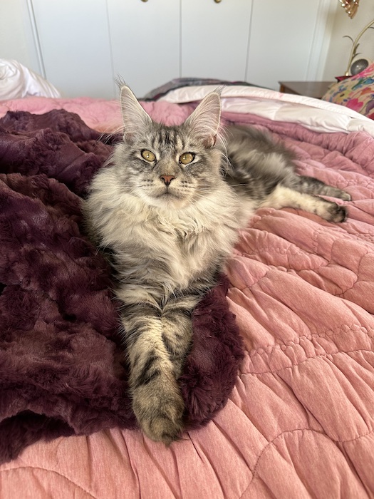 Billy is so big now, even though he is still *silly voice* just a baby! Apparently Maine Coons grow for 3-5 years, so their kittenhood is elongated much like their big old fluffy rabbit feet. We have this ongoing game where I catch his eye and gaze at him intently — this is how we know The Game is On — and then go inching around a corner so I can only see him a little bit, while he simultaneously flattens out or slinks behind something, then we carefully peek at each other while his butt starts to waggle then RARGH! He comes flying at me with paws raised! And sometimes even though I am very much aware that he is incoming he still manages to startle me!