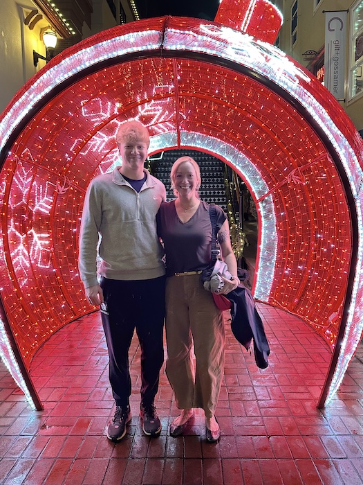 Last night I took Dylan to a new-to-us place for dinner, fancier fare than our usual, and the food was so good and afterwards we poked around the outdoor mall a bit and all the lights were doing their thing and a nice couple took our picture after I took theirs (my favorite little mini favor exchange!):