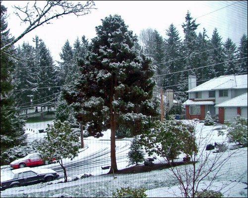 Looking out my bedroom at Seattle's first snowfall. See that red car? That's the one I sort of, um, smashed into.