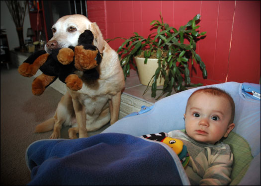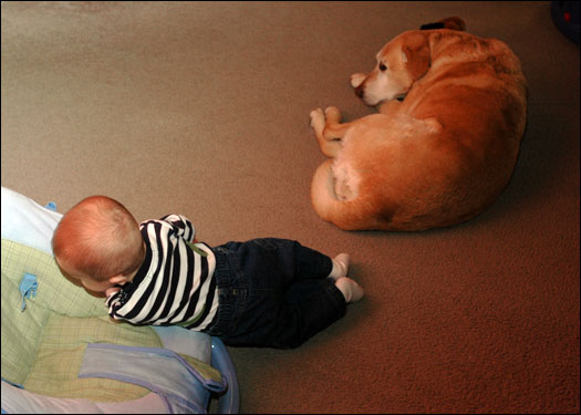 Yes, you're such a good girl! Alert and ready to protect the family! From...uh...stuffed Rottweilers. But alert! And poised to help, should the boy be in any distress!