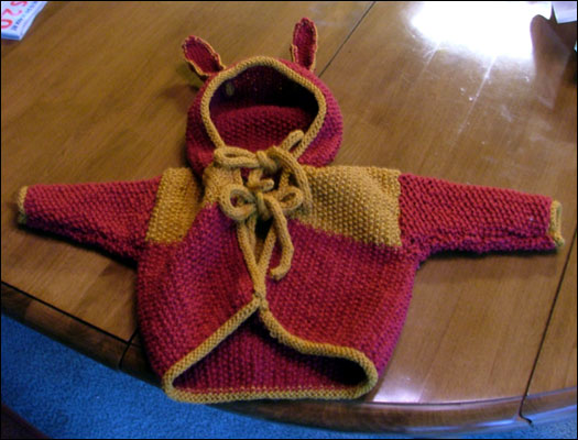 JB, having watched me ponderously mouth-breathe my way through two scarves and half a hat before abandoning knitting altogether months ago, was way impressed over this little coat (which also has matching booties!). "She knitted that?" he said incredulously. "All by herself? Wow, she's really good. Will she make me a hat? Because I only have half of one." "I think I hear your Xbox calling," I sniffed.