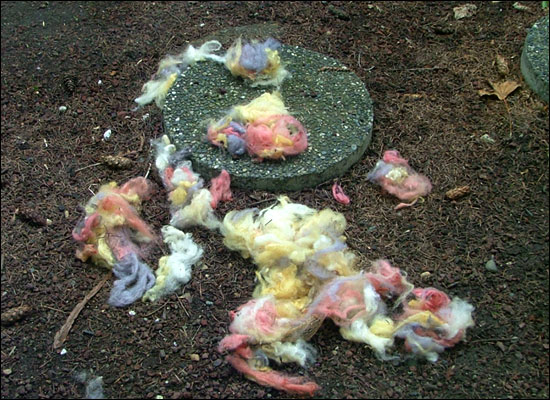 Remember that ball of wool for the birds I showed you a couple days ago? Well, this is what it looks like now. Is it possible the birds decimated it to this degree? Or should I be blaming a certain fur-covered, four-legged, butt-chewing DOG?