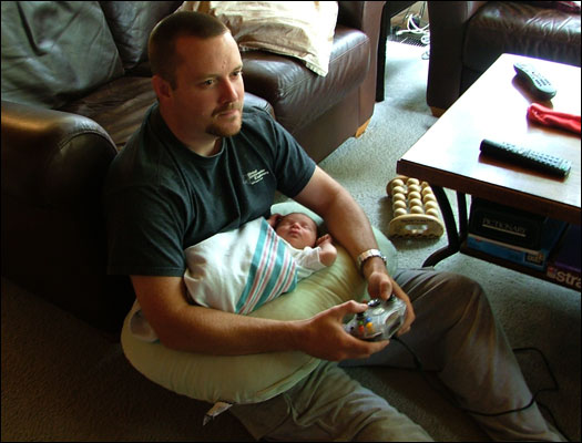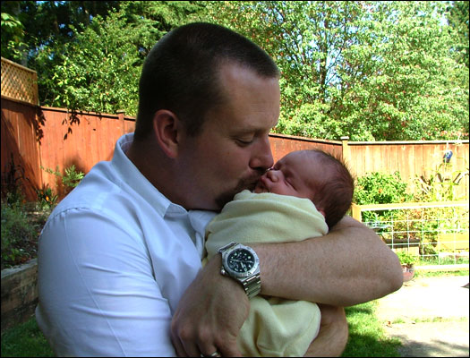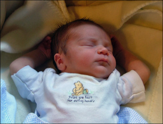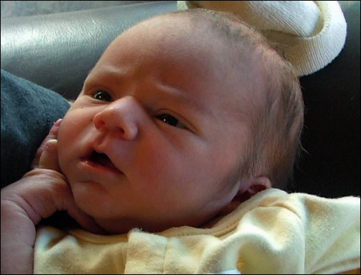 It seems to me I had several people tell me how unrewarding it is to take care of a newborn, because they "just lie there like a lump" all day long. Well, I am here to tell you otherwise. Riley does indeed spend part of his day imitating a bag of flour, but at other times he is as lively as a squid, and about as easy to dress. He rarely cries, OH THANK YOU GOD, but will often furrow his brow, flail his arms, and bleat in protest when we're submitting him to such indignities as a diaper change, and it's so funny to see, the Very Angry Baby. He snorts like a little pig, he yawns huge squeaky yawns, he makes a luscious series of "eh....eh....eh" sounds while he's hoovering his dinner. When he's resting, you can watch a myriad of expressing cross his face, like clouds moving across the sky, like a Broadway actor warming up before striding on stage: Happy! Sad. Oh, so sad. ANGER! Peaceful. Confused?