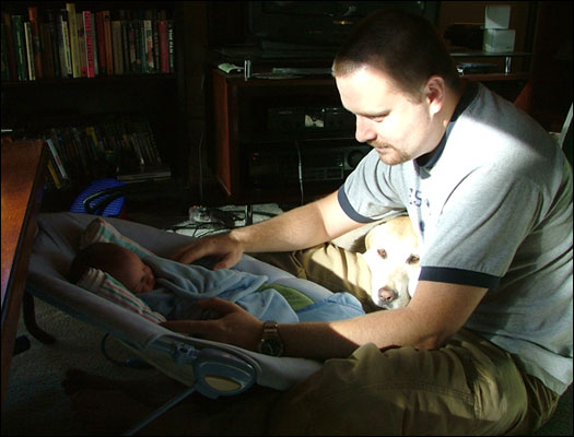 (Some of you have asked how the pets have reacted to Riley's presence. Cat does not care. Cat says she will burn all of your houses down and shit in your closet. Cat is evil. Dog, however, is curious, and upset when the baby cries. She's a little jealous, but we are giving her much love, despite her hoopty-ass fur, which is NOT growing back very well.)