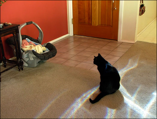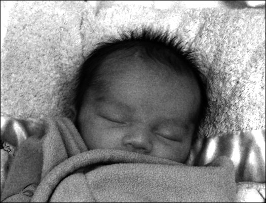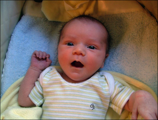 On average I get up with the baby twice in the wee hours of the evening, while JB brackets these tasks by doing the last feeding of the night and the first in the morning. It's pretty good teamwork, really, but I do find it a bit unfair that JB can actually sleep at night, while I remain aware of every snort, gurgle, and moan Riley produces. I turn on the light every so often to make sure that airways are open and socks have not mysteriously been stuffed down tracheas, and the rest of the time I lie in a tense half-doze, simultaneously praying for silence from the bassinet and worrying that things are TOO quiet.